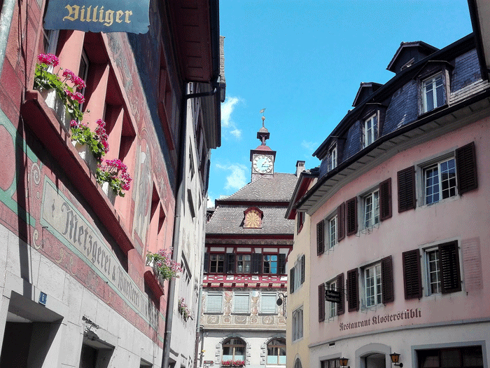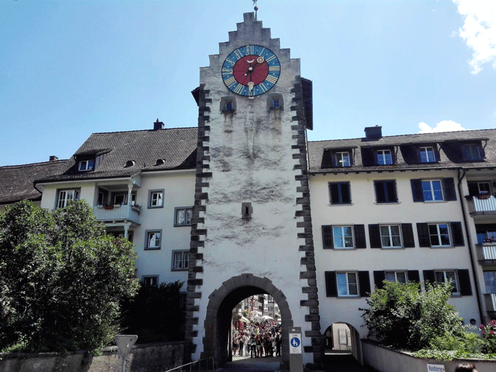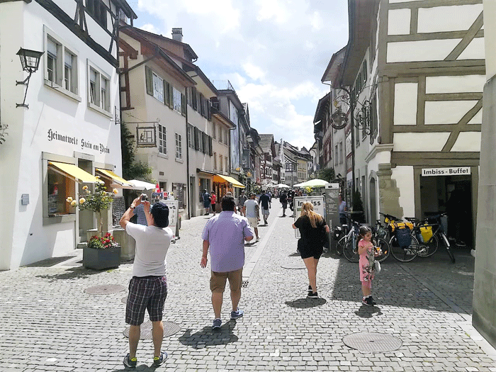 Don Viajón y su peña iniciaron el tour turístico en la antigua puerta inferior “Untertor” de Stein am Rhein, que desde el siglo XIV hizo parte del sistema defensivo de la villa. Apenas atravesar la puerta empieza el encanto. Te encontrarás con bellas casas de entramado de madera adornadas con geranios rojos y antiguas fuentes. También está el museo Lindwurm con un dragón en su fachada donde hay una exposición permanente de la vida agrícola y burguesa del siglo XIX.