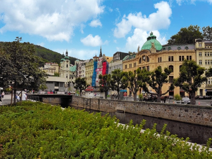 La ciudad de Karlovy Vary es un completo parque pues está rodeada por boscosas colinas, tiene extensos jardines con estanques, algunos al estilo inglés y, además, la surcan las aguas hirvientes del río Teplá.