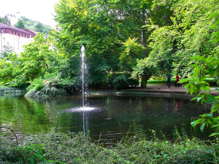 Descendimos por esta calle hasta el parque municipal donde está la columnata del Parque con esculturas románticas y fuentes termales rodeadas de una exuberante naturaleza. También hay un pequeño estanque y el río Teplá con sus hirvientes aguas.