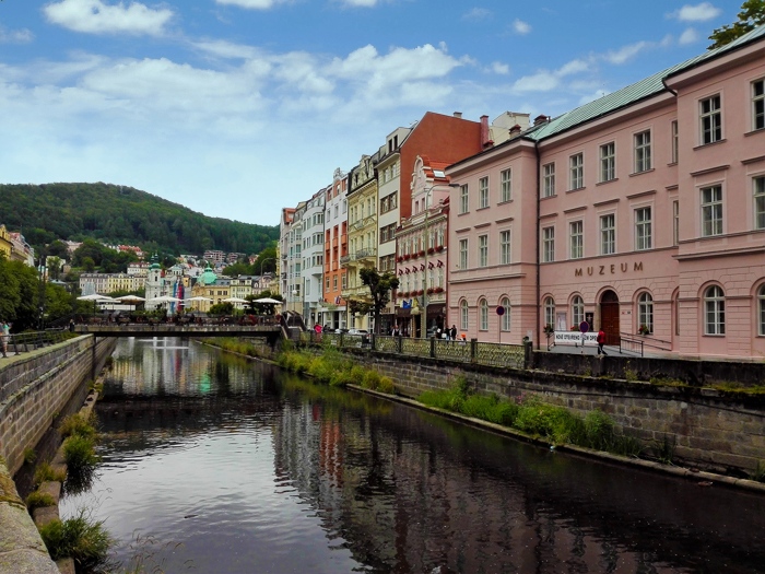 Karlovy Vary ubicada a 447 msnm en el angosto valle boscoso del hirviente río Teplá cuyas aguas discurren hacia el sur en busca del río Ohře, que nace en la montaña de la nieve “Schneeberg” en el estado federado de Baviera en Alemania. Es conocido en alemán con el nombre de Eger y recorre 316 km, de los cuales 251km atraviesan el noroccidente de Bohemia hasta verter sus aguas en el río Elba en la ciudad de Litoměřice.
