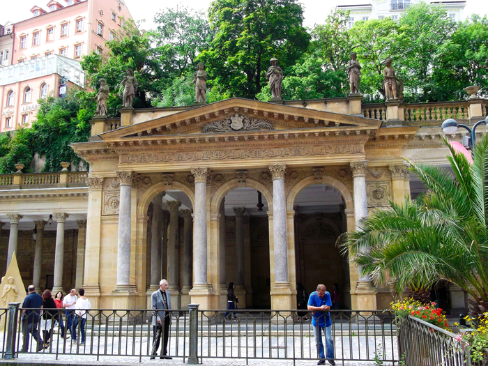 Siguiendo el curso del río Teplá está la columnata del Molino, que es la más grande y antigua de la ciudad de Karlovy Vary. Fue construida en la década de 1870 en estilo neorrenacentista con doce personajes alegóricos y cinco fuentes termales. Su simetría es una belleza, a Don Viajón ¡le fascinó!
