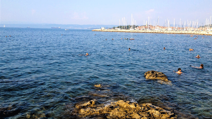 Nuestra primera parada fue la playa de Žusterna en la ciudad portuaria de Koper, la cual estaba a tope de bañistas, mascotas y motos. Para gran sorpresa de Don Viajón y su gente no había playa como tal. Es tan sólo la costa de la mar pegada al pavimento o asfalto de la calle y del andén, los cuales son usados por los bañistas como “playa”. Aun así, nos dimos un corto chapuzón en las refrescantes aguas del Adriático y proseguimos nuestro recorrido hacia Izola en busca de una verdadera playa de arena, como la que estamos acostumbrados a disfrutar en España. Seguimos la carretera costera y recorrimos los 7.5 km hasta llegar a la playa Simonov zaliv, la cual es lo mismo que la anterior pero más pequeña y pegada al acantilado, así que no nos quedamos ahí y seguimos hacia la ciudad de Pirán en búsqueda de la playa Fornače, la cual está antes del puerto deportivo.